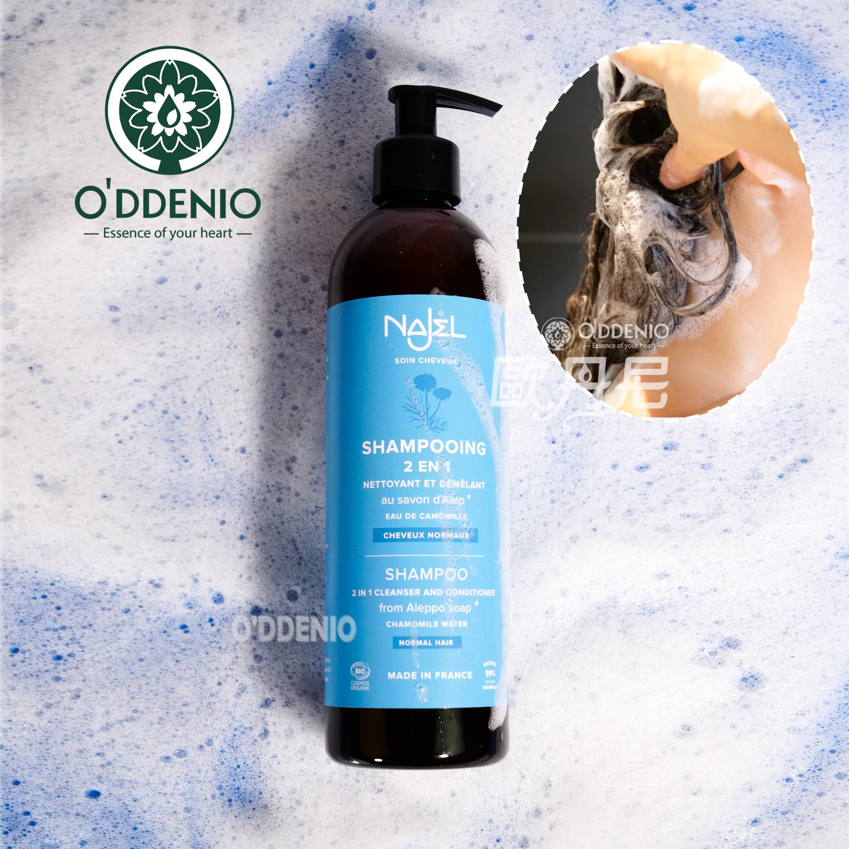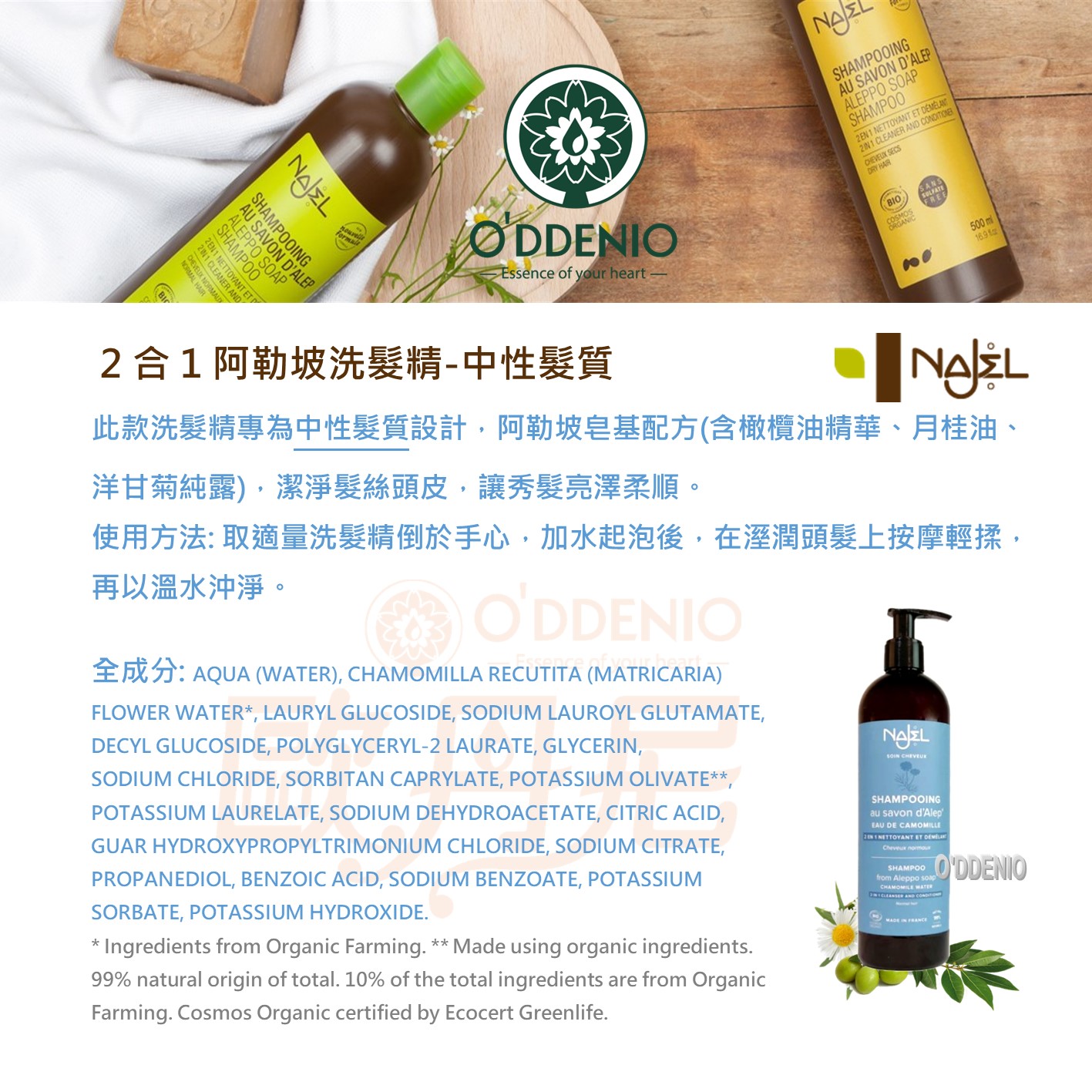 商品名稱:Najel2合1阿勒坡洗髮精-中性髮質 適用性質:中性髮質 重量:500 ml 用途:清潔頭髮 產地:法國 主要成分:月桂油、橄欖油精華、洋甘菊純露配方 全成分:AQUA (WATER), CHAMOMILLA RECUTITA(MATRICARIA) FLOWER WATER*, LAURYL GLUCOSIDE, SODIUM LAUROYL GLUTAMATE, DECYL GLUCOSIDE, POLYGLYCERYL-2 LAURATE, GLYCERIN**, SODIUM CHLORIDE, SORBITAN CAPRYLATE, POTASSIUM OLIVATE**, POTASSIUM LAURELATE**, SODIUM DEHYDROACETATE, CITRIC ACID, GUAR HYDROXYPROPYLTRIMONIUM CHLORIDE, SODIUM CITRATE, PROPANEDIOL, BENZOIC ACID, SODIUM BENZOATE, POTASSIUM SORBATE, POTASSIUM HYDROXIDE. *ingredients from Organic Farming. **made using Organic ingredients. 99% natural origin of total. 10% of the total ingredients are from Organic Farming. Cosmos Organic certified